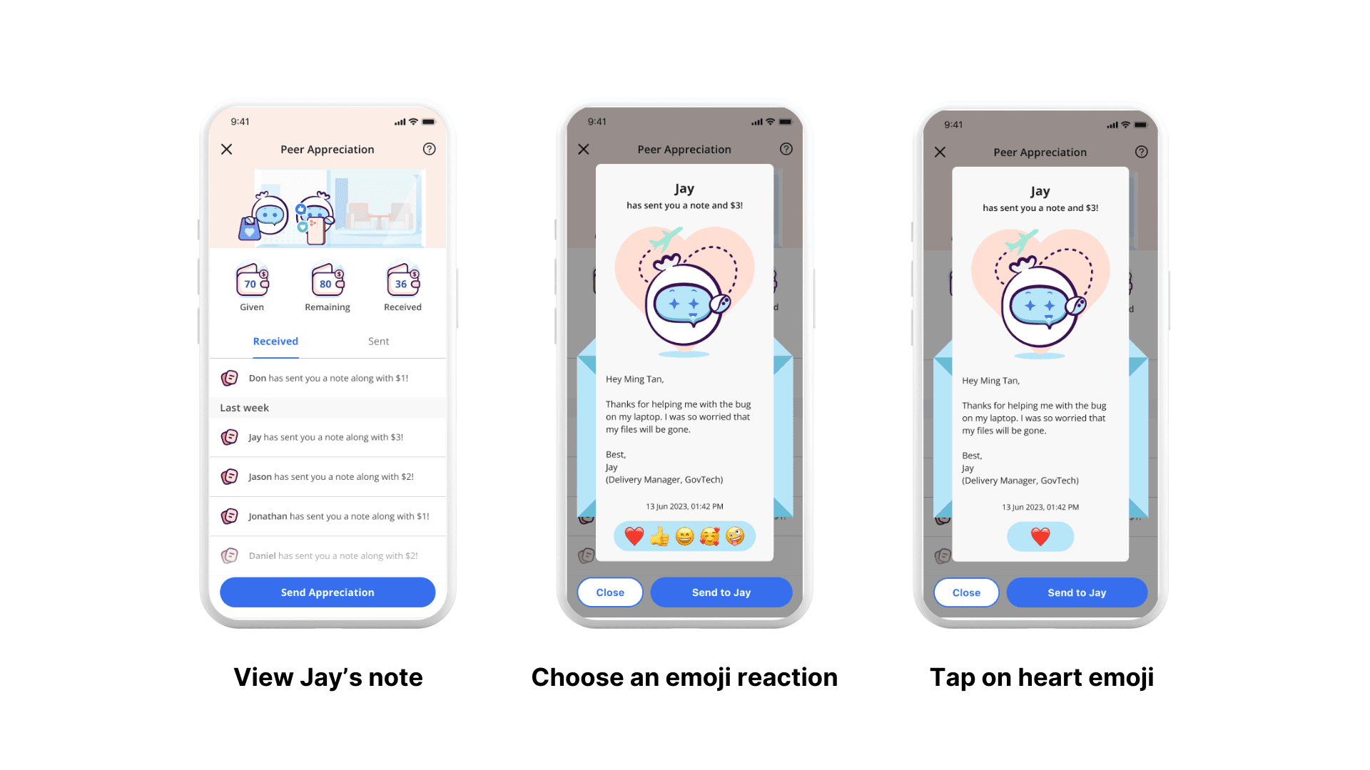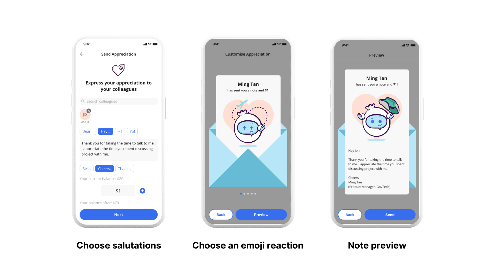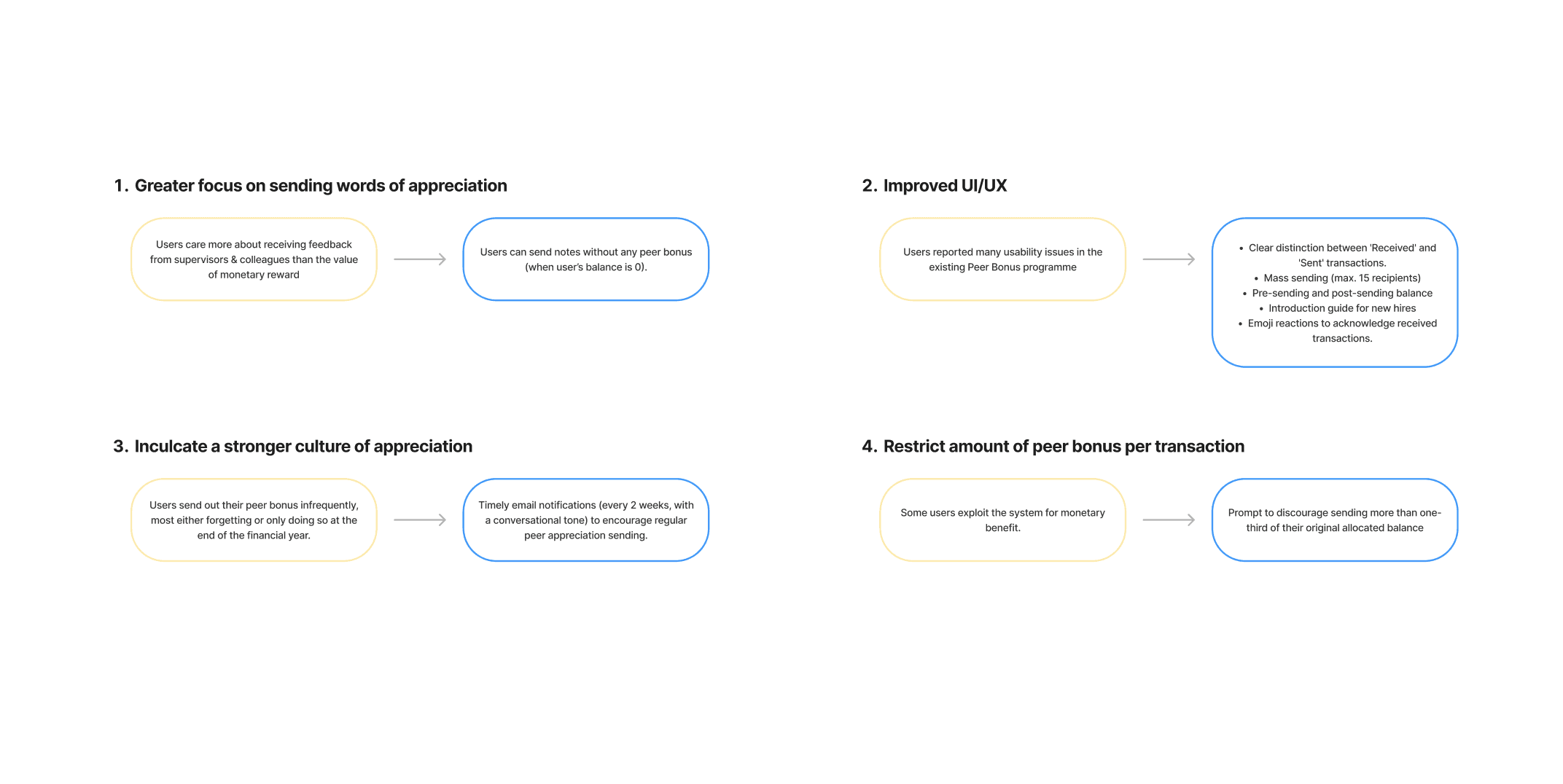 During my previous internship with GovTech, I was involved in the revamp of the Peer Bonus programme, a peer-to-peer cash reward programme. Peer Bonus was introduced with the objective of empowering public officers to recognise their colleagues who have been collaborative and contributed to their success.