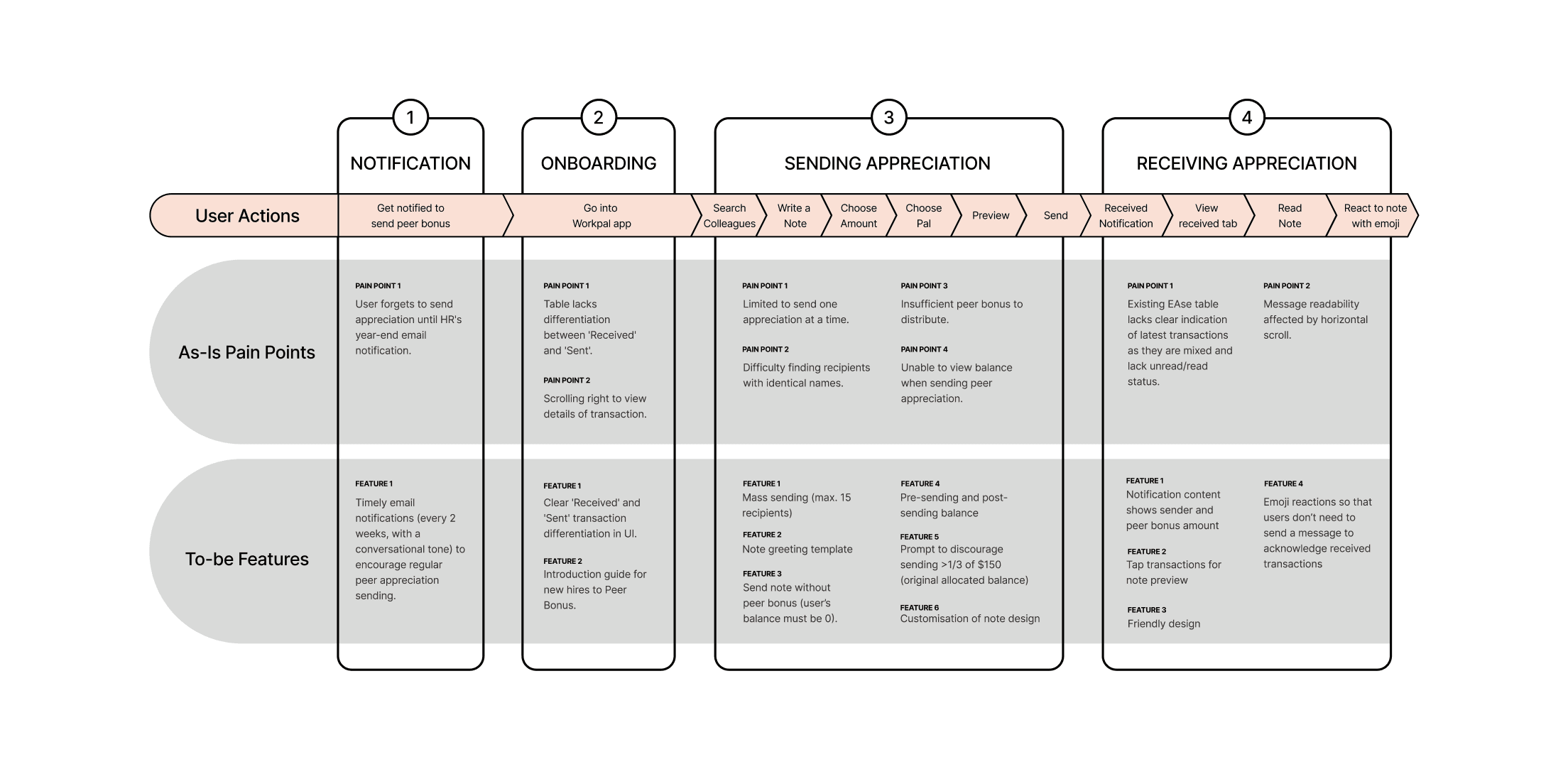 With the features prioritised, we crafted a user journey to show the different stages of the user flow in which the proposed features will alleviate as-is pain points.